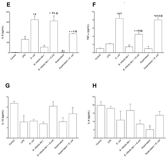 Cytokine levels in the culture medium of Caco-2 cells after 8 h of treatments. (A) IL-1β. (B) IFN-γ. (C) IL-12 p70. (D) IL-6. (E) IL-8. (F) TNFα. (G) IL-10. (H) IL-4. Results are expressed in pg/mL as the mean ± SEM of three independent experiments. * p < 0.05 vs. control (untreated cells); # p < 0.05 vs. LPS; + p < 0.05 vs. E. coli; $ p < 0.01 vs. B. infantis IM-1®; & p < 0.01 vs. B. infantis IM-1® + E. coli; @ p < 0.001 vs. supernatant.
