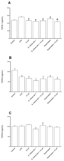 TGF-β levels in the culture medium of Caco-2 cells after 8 h of treatments. (A) TGF-β1. (B) TGF-β2. (C) TGF-β3. Results are expressed in pg/mL as the mean ± SEM of three independent experiments. * p < 0.05 vs. control (untreated cells); # p < 0.05 vs. LPS; + p < 0.05 vs. E. coli; $ p < 0.01 vs. B. infantis IM-1®; @ p < 0.001 vs. supernatant.