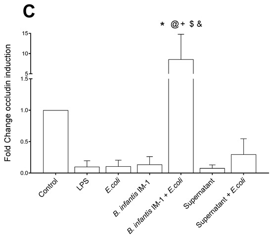 Expression of IL-6 (A), TLR-4 (B) and occludin (C) genes by Caco-2 cells determined by qRT-PCR. Results are expressed as the mean ± SEM of three independent experiments. Changes in gene expression are expressed as fold change versus unstimulated Caco-2 cells. * p < 0.05 vs. control (untreated cells); # p < 0.05 vs. LPS; + p < 0.05 vs. E. coli; $ p < 0.01 vs. B. infantis IM-1®; & p < 0.01 vs. B. infantis IM-1® + E.coli; @ p < 0.001 vs. supernatant.