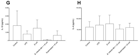 In general, the Caco-2 cells treated with LPS and E. coli CECT 515 for 8 h secreted higher levels of pro-inflammatory cytokines to the culture medium compared with untreated cells (Figure 2). IL-1β and IL-12 levels were not affected by B. infantis IM-1® either in the presence or absence of E. coli CECT 515 (Figure 2A,C). However, B. infantis IM-1® supernatant reduced IL-12 levels in the presence of E. coli in comparison with LPS-treated Caco-2 cells (Figure 2C). Interestingly, B. infantis IM-1® and its supernatant were capable of reducing both IFN-γ and IL-6 in the presence of E. coli CECT 515 (Figure 2B,D). Additionally, B. infantis IM-1® supernatant reduced IL-8 levels both in the presence of E. coli (Figure 2E), and B. infantis IM-1® decreased the secretion of TNF-α in E. coli-treated Caco-2 cells (Figure 2F). Finally, B. infantis IM-1® supernatant reduced the secretion of IL-4 in Caco-2 cells incubated in the absence of E. coli CECT 515 (Figure 2H).