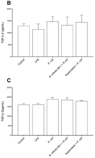 Unlike the single cultures of Caco-2 cells, in co-cultures of Caco-2 plus DCs, the strongest pro-inflammatory effects in cytokine secretion were observed with LPS and not with E. coli CECT 515 (Figure 5). Treatment of the co-cultures with B. infantis IM-1® or its supernatant together with E. coli CECT 515 resulted in reductions in IL-1β and IFN-γ, compared with the LPS-treated co-cultures (Figure 5A,B). Comparisons with E. coli CECT 515-treated co-cultures did not reach statistical significance. Similar trends were observed for IL-6, IL-8 and TNF-α (Figure 5D–F). No changes whatsoever occurred in TGF-β levels (Figure 6).