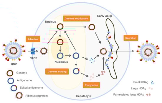 - Goodrum, G.; Pelchat, M. Insight into the Contribution and Disruption of Host Processes during HDV Replication. Viruses 2018, 11, 21. [Google Scholar] [CrossRef]