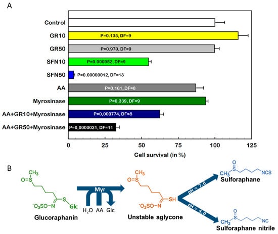 - Kontar, S.; Imrichova, D.; Bertova, A.; Mackova, K.; Poturnayova, A.; Sulova, Z.; Breier, A. Cell death effects induced by sulforaphane and allyl isothiocyanate on p-glycoprotein positive and negative variants in l1210 cells. Molecules 2020, 25, 2093. [Google Scholar] [CrossRef]
