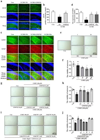 Using glial fibrillary acidic protein (GFAP) to label astrocyte, we observed a large loss of astrocytes in the hippocampus of UCMS treated mice, which was consistent with literature reports. PPARβ/δ agonist GW0742 significantly reversed the decreases in astrocytes (Figure 2a,b). Simultaneously, treatment with GW0742 significantly increased the co-localization of GFAP and glia-derived neurotrophic factor (GDNF) (yellow staining) (Figure 2c,d), suggesting that PPARβ/δ activation also improved the protection for astrocytes. In the primary cultured astrocytes, 100 µM of corticosterone significantly decreased the cellular viability (Figure 2e,f). Consistently, the viability of astrocytes was restored by treatment with 0.1 µM PARβ/δ agonist GW0742 (Figure 2g,h). The protection of GW0742 were prevented by the PARβ/δ antagonist GSK3787 at a concentration of 1 µM (Figure 2i,j). The findings confirm that PARβ/δ agonist protects astrocytes against the injury in depressive models.