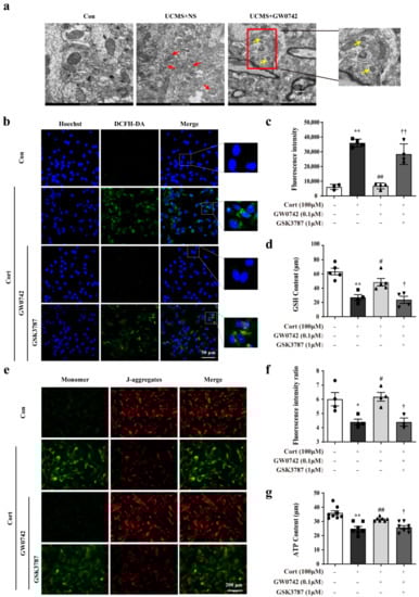 In the mice exposed to UCMS, a large number of damaged mitochondria were observed via transmission electron microscopy, accompanied by mitochondrial swelling, disordered arrangement of cristae, and mitochondrial fusion (showing as red arrows, Figure 3a). Treatment with GW0742 could significantly ameliorate the UCMS-induced structural damages of mitochondria in hippocampal astrocytes (Figure 3a).