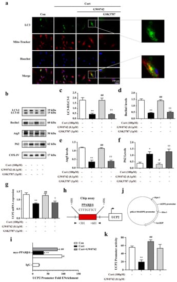 Uncoupling protein 2 (UCP2) is a mitochondrial inner-membrane protein, which plays a critical role in mitochondrial function, including control of reactive oxygen species (ROS) generation and fuel utilization. UCP2 is a canonical target gene of PPARβ/δ [34]. We found that PPARβ/δ activation dramatically reversed the decreasing of UCP2 mRNA levels by corticosterone (Figure 4g). A chromatin immunoprecipitation (ChIP) assay performed in the astrocytes infected with a myc-tagged PPARβ/δ DNA construct showed that PPARβ/δ bound to the UCP2 promoter (Figure 4h,i). The results from double luciferase reporter gene test revealed that GW0742 significantly enhanced the lower UCP2 promoter activity (Figure 4k). In summary, we find that PPARβ/δ activation promotes mitophagy by binding to UCP2 promoter, which increases the activity of UCP2 promoter and the expression of UCP2.