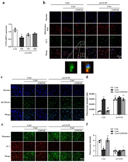Furtherly, we used siRNA to knockdown UCP2 to confirm that UCP2 is a key regulatory protein of PPARβ/δ activation-mediated protective effects. Compared to siRNA-UCP2 (769) and siRNA-UCP2 (840), transfection with siRNA-UCP2 (918) resulted in a 50% suppression of UCP2 expression (Figure 5a). Then, UCP2 siRNA (918) was used for transfection in the subsequent experiments. Figure 5b showed that knocking down UCP2 prevented mitophagy increased by GW0742 in the astrocytes.