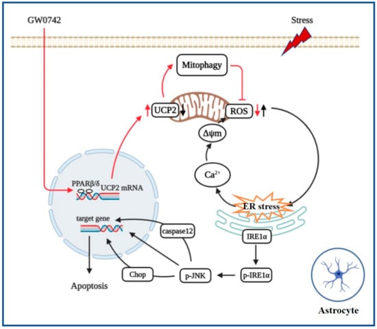 PPARβ/δ agonist protects against oxidative stress and ER stress-induced astrocytic apoptosis by inhibiting the phosphorylation of IRE1α, which are due to enhancing UCP2-dependent mitophagy.