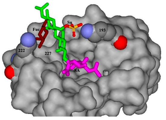 Change in the receptor specificity of viruses is determined by mutations in the region of the receptor-binding site of hemagglutinin. The six amino acids in the HA receptor-binding site are highly conserved among avian viruses but bear substitutions in human viruses (A138S, E190D, L194I, and G225D for H1 HA or Q226L and G228S for H2 and H3 HA) [15]. Substitutions X222Q and S227R enhanced binding to fucosylated sialylologosaccharides during the adaptation of the virus to gulls [14,16]. 193K is typical for H5 viruses. It can be speculated that the interaction of positively charged 193K with the 6-O-Su-group of glucosamine enhances the binding with sulfated receptor [11] (See also Figure 1).