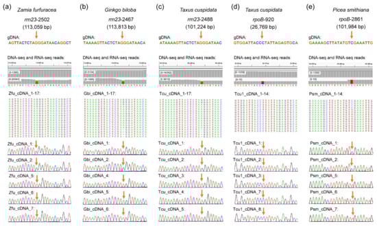 - Chen, H.; Deng, L.; Jiang, Y.; Lu, P.; Yu, J. RNA Editing Sites Exist in Protein-coding Genes in the Chloroplast Genome of Cycas taitungensis. J. Integr. Plant Biol. 2011, 53, 961–970. [Google Scholar] [CrossRef]