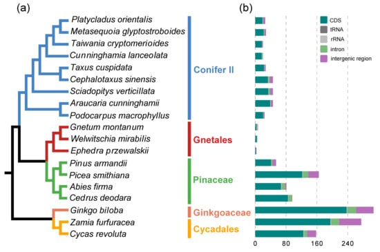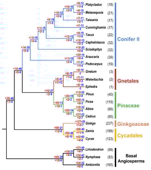 - Kan, S.-L.; Shen, T.-T.; Ran, J.-H.; Wang, X.-Q. Both Conifer II and Gnetales are characterized by a high frequency of ancient mitochondrial gene transfer to the nuclear genome. BMC Biol. 2021, 19, 146. [Google Scholar] [CrossRef] [PubMed]