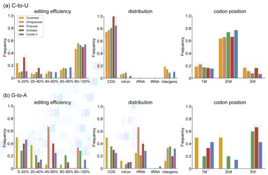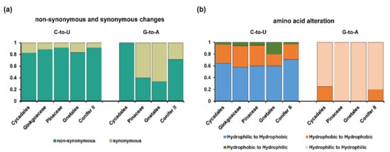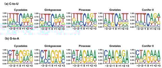 3.1. G-to-A, a Novel Type of RNA Editing Site, Is Common in Gymnosperm Plastomes