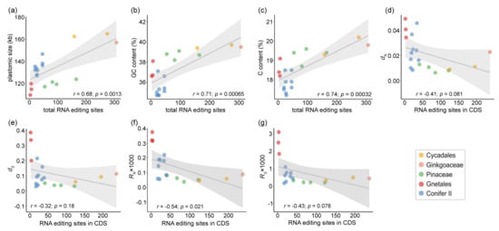 2.3. Factors Correlated with the Number of Chloroplast RNA Editing Sites in Gymnosperms