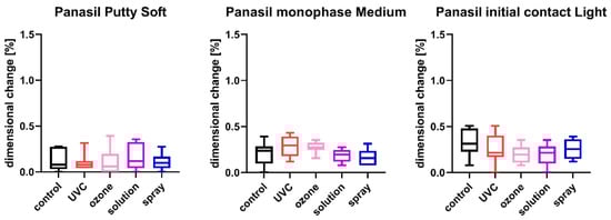 To reduce dimensional changes of dental elastomers, various alternatives to chemical sterilization have been looked for, such as steam autoclaving, microwave disinfection, or UVC radiation [,]. Samra et al. reported that exposure to UVC radiation for 3 min did not significantly influence the dimensional stability of alginates and A-silicones in comparison to nondisinfected controls. However, their study did not evaluate the antimicrobial effectiveness of such a short period of disinfection []. Another study also showed that UVC disinfection for a short time (10 min) had no effect on the dimensional stability of both putty and light-bodied addition-type silicone (Reprosil) []. Furthermore, it was shown that UVC radiation for 20 min did not influence the dimensions of the impression taken using heavy body elastomeric material followed by the wash impression based on light-body impression material (Aquasil) []. In our study, we applied UVC for 40 min, in accordance with the recommendations of the UVC lamp manufacturer and a previous paper proving the effectiveness of this disinfection period [].