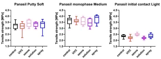 Tensile strength of A-silicones (Panasil Putty Soft, Panasil monophase Medium, and Panasil initial contact Light) after disinfection using various methods.