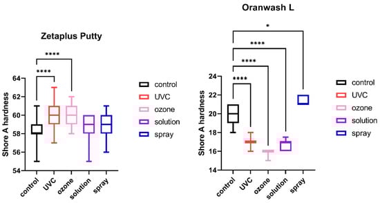 Shore A hardness of C-silicones (Zetaplus Putty and Oranwash L) after disinfection using various methods; * p < 0.05 and **** p < 0.0001 for the comparison between the study (disinfected) groups and the control (nondisinfected) group.