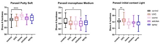 Shore A hardness of A-silicones (Panasil Putty Soft, Panasil monophase Medium, and Panasil initial contact Light) after disinfection using various methods; * p < 0.05, ** p < 0.01, and **** p < 0.0001 for the comparison between the study (disinfected) groups and the control (nondisinfected) group.