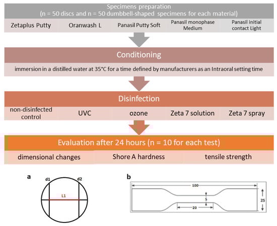Study design with a schematic representation of (a) the test block used for the measurement of dimensional change in accordance with the ISO 4823:2015 standard and (b) the dumbbell-shaped test specimen used for the measurement of tensile strength in accordance with the ISO 37:2017(E) standard.