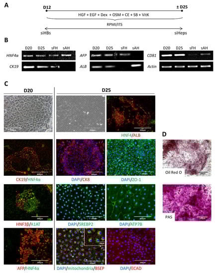 siHBs were harvested using cell dissociation buffer (0.1 mg/mL EDTA, 0.5 mg/mL BSA) and seeded onto collagen I-coated plates in RPMI/B27, 10% Fetal Bovine Serum (FBS, Gibco, Waltham, MA, USA), 1% bovine serum albumin (BSA, Sigma, St. Louis, MO, USA), and 50 ng/mL HGF for four hours to enable cell attachment. The medium was then replaced by RPMI/ITS with 50 ng/mL HGF, 3 nM CHIR-99021 (Stemcell Technologies, Vancouver, WA, Canada) and 0.1 ng/mL TGF-β1 (Peprotech, Cranbury, NJ, USA), for 24 h. The medium was changed every day until the end of the differentiation with 20 ng/mL HGF, 0.05 nM dexamethasone (Sigma, St. Louis, MO, USA), 10 ng/mL oncostatin M (Peprotech, Cranbury, NJ, USA), 0.25 nM Compound E (Santa Cruz, Dallas, TX, USA), 2.5 nM SB431452 (Tocris, Bristol, UK) and 10 ng/mL vitamin K1 (Roche, Basel, Switzerland).