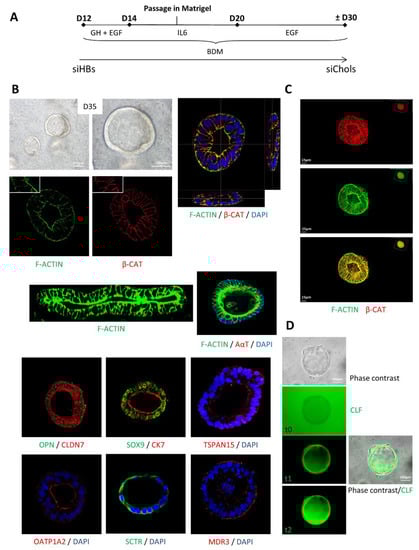To further differentiate the cells, we generated 3D structures in hydrogel (Figure 4A). We observed round hollow structures composed of a layer of polarized cells (visualized by the beta-catenin labeling at the basolateral pole of the cells and F-actin at the apical side) (Figure 4B). In these structures, cells expressed cholangiocyte-specific markers such as OPN, SOX9, CK7, claudin-7 (a tight junction protein), OATP1A2, tetraspanin 15 and the secretin receptor. MDR3 (involved in bile acid efflux) was expressed on the basolateral membrane of the cholangiocytes. The 3D reconstruction confirmed the presence of a lumen within the cyst (Figure 4C). When the cysts were incubated with cholyl-lysyl-fluorescein—a fluorescent derivative of bile salts whose uptake into a cell is mediated by organic anion transporter proteins (OATPs) and apical secretion is mediated by multidrug resistance protein 2 (MRP2)—an accumulation of fluorescence was detected within the central lumen (Figure 4D).