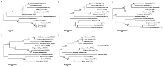 - Tang, Z.; Sun, C.; Yan, A.; Wu, S.; Qin, C.; Zhang, Y.; Li, W. Genes involved in fatty acid metabolism: Molecular characterization and hypothalamic mRNA response to energy status and neuropeptide Y treatment in the orange-spotted grouper Epinephelus coioides. Mol. Cell. Endocrinol. 2013, 376, 114–124. [Google Scholar] [CrossRef] [PubMed]