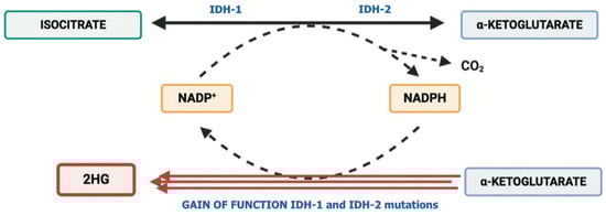 Schematic representation of IDH1 and IDH2 mutations determining the pathological accumulation of 2-HG.