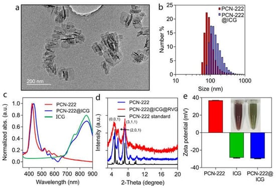 Characterization of PCN−222@ICG nanosystem. (a) TEM image of PCN−222@ICG nanosheet. (b) DLS size of PCN−222 and PCN−222@ICG. (c) UV-vis spectra of PCN−222 and PCN−222@ICG. (d) Powder XRD spectra of PCN−222 and PCN−222@ICG. Three obvious peaks can be assigned to (0, 0, 1), (2, 0, 1), and (3, 1, 1). (e) Zeta potential of PCN−222, free ICG, and PCN−222@ICG. Inset is a photograph of PCN−222 before (left) and after (right) coupling with ICG. Each measurement was conducted three times.