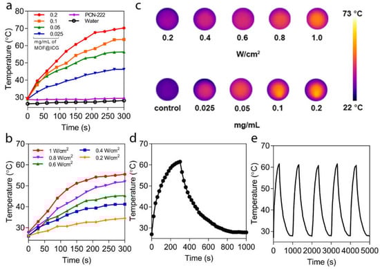 Photothermal effect of PCN−222@ICG. (a) Concentration-dependent temperature increase for PCN−222@ICG. Here, PCN−222 with a concentration of 0.2 mg mL−1 and a DI water sample are used as control groups. (b) Power-density-dependent temperature increase of PCN−222@ICG. (c) Thermal images of PCN−222@ICG probes for various concentrations and power-densities. (d) Single heating/dissipation cycle of PCN−222@ICG. (e) Photothermal stability testing of PCN−222@ICG for five cycles.