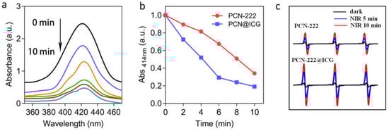 Photo-oxygenation capability of PCN−222@ICG. (a) UV-vis absorbance of DPBF in the presence of PCN−222@ICG when exposed to NIR light for 0–10 min (black to cyan represents 0 min to 10 min with a 2-min interval). (b) Comparison of UV-vis absorbance signal of DPBF at 414 nm between PCN−222 and PCN−222@ICG upon NIR light for 0–10 min. (c) ESR spectra of PCN@222 and PCN−222@ICG after exposure to NIR light for 5 min and 10 min.