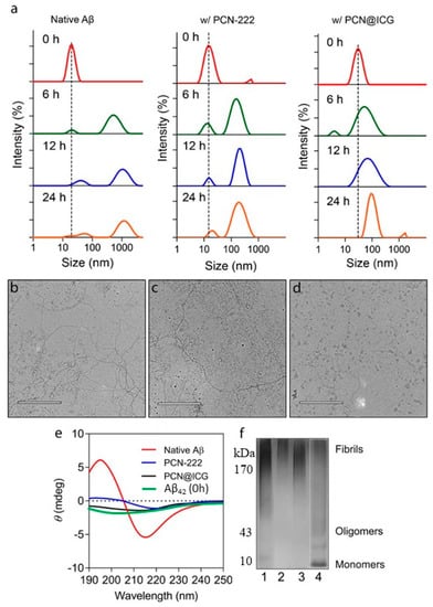 Dynamic Light Scattering (DLS) and Transmission Electronic Microscopy (TEM) were used to evaluate the Aβ aggregation dynamic process in a 24 h time-dependent inhibition study. DLS measurement showed that untreated Aβ42 monomers quickly increased in size from ~10 nm to ~800 nm within 6 h, and then, further increased to ~1000 nm at 24 h (Figure 4a). Photo-activated PCN−222 with NIR irradiation (0.025 mg mL−1, 0.6 W cm−2, 30 min) showed a certain inhibition effect on Aβ42 aggregation with a size increase to ~200 nm at 24 h. In contrast, photo-activated PCN−222@ICG with NIR irradiation (0.025 mg mL−1, 0.6 W cm−2, 30 min) showed a strong inhibition effect on Aβ42 aggregation with a size increase to only ~90 nm at 24 h. TEM images also clearly showed distinct differences in morphology among Aβ42 monomer samples incubated in the absence of nanoprobes, and in the presence of NIR-activated PCN−222 and photo-activated PCN−222@ICG nanoprobes. The Aβ42 monomer group in the absence of nanoprobes at 24 h clearly showed morphology of the amyloid fibril mesh network (Figure 4b), and Aβ42 with photo-activated PCN−222 showed a low degree of formation of amyloid fibrils (Figure 4c). In contrast, the Aβ42 monomer group incubated with photo-activated PCN−222@ICG for 24 h could more efficiently prevent Aβ42 from aggregating to a larger size without forming amyloid fibrils (Figure 4d). In contrast, there was no obvious aggregation of the Aβ42 monomer at 0h (Figure S4). Our studies demonstrated that NIR-activated PCN−222@ICG was able to more noticeably inhibit Aβ42 aggregation than PCN−222 alone by controlling the size of Aβ structures to sub-100 nm. To further analyze the enhanced effect of PCN−222@ICG on inhibiting the aggregation of Aβ42 monomers to high-degree structures, circular dichroism (CD) was used to evaluate the secondary structure of the Aβ42 aggregate. The untreated Aβ42 sample after 24 h of incubation at 37 °C showed a characteristic peak at 216 nm in the CD spectrum, which was a typical profile of the β-sheet-rich secondary structure of amyloids (Figure 4e). In contrast, the Aβ42 sample treated with photo-activated PCN−222 and PCN−222@ICG with NIR irradiation (0.025 mg mL−1, 0.6 W cm−2, 30 min), followed by 24 h of incubation at 37 °C, showed a low peak amplitude at 216 nm, indicating an inhibition effect on the formation of the secondary structure of amyloids. Native polyacrylamide gel electrophoresis (PAGE) analysis was also conducted to compare the inhibition effect of PCN−222 and PCN−222@ICG on the formation of high-degree structures of amyloids after incubation for 24 h. In Figure 4f, lane 1 represents untreated Aβ42, lane 2 represents PCN−222 with NIR laser irradiation, lane 3 represents PCN−222@ICG without NIR laser irradiation, and lane 4 represents PCN−222@ICG with NIR laser irradiation. Compared with the other groups from lane 1 to lane 3, which mostly showed aggregation of high-molecular-weight Aβ42 oligomers and fibrils, lane 4 of PCN−222@ICG with NIR laser irradiation showed multiple bands of low-order structures, including monomers and oligomers (Figure 4f). This indicated that photo-excited PCN−222@ICG could efficiently inhibit the conversion of Aβ42 monomers to high-order structures. The FT-IR spectrum of Aβ42 incubated for 24 h in the absence of nanoprobes revealed a characteristic peak at 1636 cm−1, which clearly indicated the formation β-sheet structure (Figure S5). In contrast, the Aβ42 monomer group in the presence of PCN−222@ICG under NIR irradiation did not show a significant peak at 1636 cm−1, indicating an efficient inhibition effect on β-sheet structure formation.