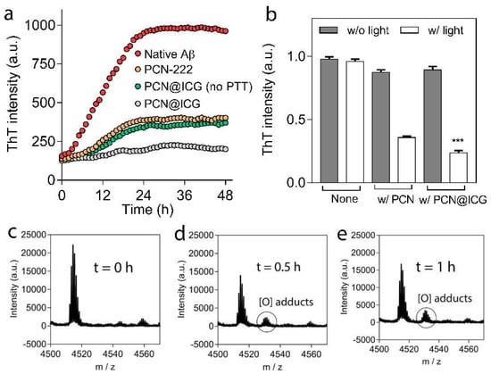The photothermal effect on the enhanced inhibition of Aβ42 aggregation can be explained as follows. Under NIR irradiation, the local photothermal heat generated by PCN−222@ICG will cause instability of the Aβ aggregate and keep most of the Aβ in the status of monomers. At the same time, Aβ42 monomers are easily photo-oxygenated by local singlet oxygen generated from PCN−222@ICG, and photo-oxygenated Aβ monomers have much lower aggregation capability compared with the native Aβ monomer. In contrast, without the photothermal effect, some native Aβ monomers will form aggregates, which greatly reduce the photo-oxygenation efficiency due to the reduced surface area exposed to singlet oxygen and the additional energy required to dissociate the Aβ aggregates. Therefore, the combination of photothermal and photo-oxygenation treatments can generate synergistic effects to largely enhance the inhibition efficiency of Aβ42 aggregation compared with a single modality of photo-treatment. The degree of Aβ42 oxygenation could be used to evaluate long-term photo-inhibition capability. For this purpose, mass spectroscopy (MS) analysis was used to analyze the formation of oxygenated adducts in the protein. Native Aβ42 monomers showed an intense signal of 4514 Da in the MS spectrum, which corresponded to the molecular weight of the native Aβ42 monomer (Figure 5c) [61]. When the Aβ42 monomers were treated with NIR-activated PCN−222@ICG, without and with photothermal effects, under NIR irradiation (0.025 mg mL−1, 0.6 W cm−2) for 5 min, and then, incubated for 0.5 h, a new peak representing an oxygenated adduct with a higher molecular weight at 4538 Da was observed in the MS spectra (Figure 5d,e). It was observed that the PCN−222@ICG group excluding the photothermal effect had less oxygenated Aβ compared with the PCN−222@ICG group with the photothermal effect; this further demonstrated our hypothesis that the photothermal effect could enhance the photo-oxygenation of Aβ. The combination of photothermal treatment and photo-oxygenation would generate a synergistic effect to effectively inhibit Aβ42 aggregation with a long-term effect.