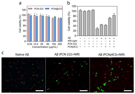 We then investigated the attenuation of Aβ-induced cytotoxicity by photo-activated PCN−222@ICG using an in vitro PC12 cell model. The PC12 cell line is a classical neuronal cell model for studying Aβ-induced cytotoxicity [62]. The intrinsic biocompatibility of PCN−222 and PCN−222@ICG were first investigated via CCK-8 assay on PC12 cells. After 24 h of incubation with PCN−222 and PCN−222@ICG, the cell viability of the PC12 cells remained over 90% at a concentration as high as 200 µg mL−1, indicating the low cytotoxicity of PCN−222 and PCN−222@ICG (Figure 6a). When co-cultured with PC12 cells, PCN−222@ICG at various concentrations showed low cytotoxicity for up to 72 h (Figure S6). We then investigated the attenuation of Aβ-induced cytotoxicity for the five groups of PC12 cells with Aβ42 in the absence of nanoprobes, in the presence of PCN−222 (25 µg mL−1) without NIR irradiation, in the presence of PCN−222 (25 µg mL−1) with NIR irradiation (0.6 W cm−2 for 30 min), in the presence of PCN−222@ICG without irradiation, and in the presence of PCN−222@ICG (25 µg mL−1) with NIR irradiation (0.6 W cm−2 for 30 min), respectively (Figure 6b). Four groups of PC12 cells without Aβ42 were used as control groups, including only PC12 cells, PC12 cells with NIR irradiation, PC12 cells with PCN−222 nanoprobes and PC12 cells with PCN−222@ICG nanoprobes. As shown in Figure 6b, the cell viability of all four control groups exceeded 90%. The group of PC12 cells with Aβ42 in the absence of nanoprobes showed a low cell viability of ~30% due to the obvious cytotoxicity of the Aβ aggregates. The addition of PCN−222 and PCN−222@ICG to PC12 cells in the presence of Aβ42 without NIR irradiation showed a slight increase in cell viability to ~40%. This could be explained by the adsorption of some Aβ42 monomers on the nanoprobe surface which prevented the absorbed Aβ42 monomers from forming neurotoxic Aβ42 aggregates. Photo-activated PCN−222 and photo-activated PCN−222@ICG nanoprobes could recover cell viability to around ~70% and ~80%, respectively, which indicated that oxygenated Aβ42 would no longer aggregate into toxic high-order structures and remained non-toxic. PCN−222@ICG nanoprobes showed especially higher cell viability compared to PCN−222@ICG, which demonstrated that photothermally assisted photo-oxygenation had a higher capability for the attenuation of Aβ-induced cytotoxicity. Florescence live/dead staining was also carried out to analyze the attenuation of Aβ-induced cytotoxicity for PC12 cells in the presence of Aβ42 with treatment using PCN-222 and PCN−222@ICG under NIR light irradiation (Figure 6c). Obviously, the cells with Aβ42 after treatment with photo-activated PCN−222@ICG showed a higher ratio of live cells with green color compared to the PCN−222 group. In contrast, the control group of PC12 cells without nanoprobe treatment showed numerous dead cells with red color. The above results demonstrate that photo-activated PCN−222@ICG had a higher ability to attenuate Aβ-induced cytotoxicity.