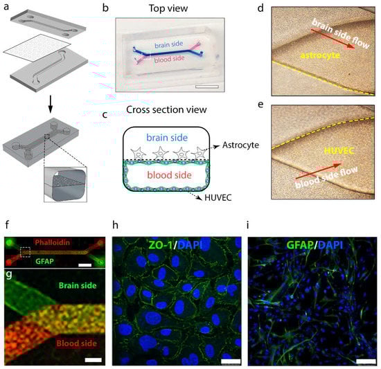 Blood–brain barrier-on-a-chip model. (a) Design of PDMS microchip and schematic illustration of BBB chip. A porous membrane was sandwiched between two PDMS parts after treatment with oxygen plasma. (b) Top view of fabricated BBB chip filled with blue ink and red ink for brain side and blood side, respectively. Scale bar: 10 mm. (c) Schematic of cross-section view of BBB chip with co-cultured endothelial cell and astrocytes. (d) Enlarged brain-side image and (e) enlarged blood-side image of microchannel junction in the white square range of BBB chip of (b). (f) Immunocytochemistry image of co-cultured HUVECs with astrocytes in the whole BBB chip. (g) Enlarged fluorescence image of microchannel junction in the white square range in (f). (h) Immunofluorescence micrographs of the HUVECs cultured on-chip for 24 h, labeled with tight junction protein ZO-1. Scale bar: 25 µm. (i) Immunocytochemistry image of GRAP of astrocytes. Scale bar: 25 µm.