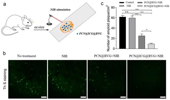 In the AD brain, particularly in the late-onset AD brain, Aβ fibrils are prone to aggregate and form Aβ plaques, which are neurotoxic to brain cells, including neurons and astrocytes [64,65,66,67]. To investigate whether the NIR-activated PCN−222@ICG@RVG nanoprobe is capable of inhibiting and disassembling high-order Aβ plaques, a transgenic AD mouse brain containing Aβ plaques was sliced and fixed on a glass slide, followed by treatment with NIR-activated PCN−222@ICG@RVG (Figure 9a). The Aβ-containing brain slice was stained using ThS, a fluorescent dye that exhibits high fluorescent emission when binding with amyloid plaques. The fluorescent images of the brain slice with different treatments, including NIR-only treatment (0.6 W cm−2), NIR treatment with PCN−222@RVG nanosheets (0.2 mg mL−1), and NIR treatment with PCN−222@ICG@RVG nanoprobes (0.2 mg mL−1), were taken to compare the Aβ plaque degree. It was obvious that NIR light alone did not affect the Aβ plaques in the brain slice, whereas PCN−222@RVG with NIR irradiation treatment and PCN−222@ICG@RVG with NIR irradiation resulted in less Aβ plaque in the brain slice (Figure 9b). Moreover, the PCN−222@ICG@RVG-with-NIR irradiation group showed a significant decrease in the fluorescence density of Aβ plaques, even compared with the PCN−222@RVG-under-NIR irradiation group; this indicates that NIR-activated PCN−222@ICG@RVG had an enhanced dissociation effect on the Aβ plaques due to the combined photo-treatment. Furthermore, to quantitatively analyze Aβ plaques in different treatments, Image J software was used to analyze the density of Aβ plaques in the ex vivo brain slice. The only NIR-treated group brain slice contained Aβ plaques with a density of 59.2 per cm2, which was similar to that of the non-treated group (61.7 per cm2). In contrast, the NIR-stimulated PCN−222@RVG group had a lower density of Aβ plaques at 25 per cm2. NIR-activated PCN−222@ICG@RVG had a remarkably low density of Aβ plaques, at only 9.3 per cm2. Moreover, the brain slice treated with NIR-activated PCN−222@ICG@RVG also exhibited much smaller Aβ plaques than the two control groups and the NIR-excited PCN−222@RVG group. This result further evidenced the enhanced Aβ plaques’ dissociation efficacy due to the combined phototherapy effects.