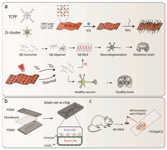 (a) Schematic illustration of synthesis of PCN−222@ICG nanoprobe and RVG peptide conjugation and Aβ-induced neurodegeneration, as well as the photo-induced inhibition of Aβ42 aggregation by a hybrid PCN−222@ICG nanoprobe modified with brain-targeting peptide RVG. (b) Fabrication process of brain-on-a-chip and cross-section view of the microfluidic channel. (c) Ex vivo evaluation of NIR-stimulated PCN@ICG for the dissociation of Aβ plaques.