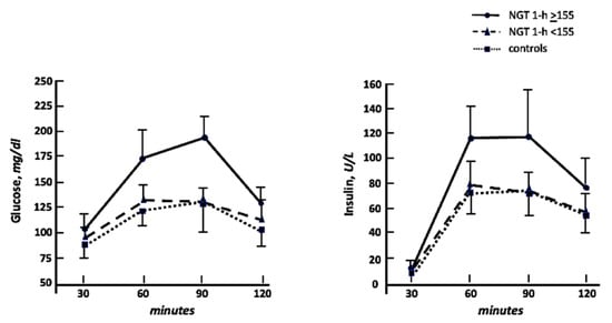 Glucose and insulin curves during oral glucose tolerance test in NGT 1-h ≥ 155, NGT 1-h < 155, and controls.