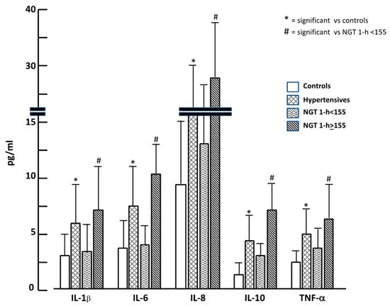 In Figure 2 we graphically reported cytokine values in the four groups; it is evident that hypertensives showed almost doubled values of cytokines when compared to the control group. The same trend was observed when comparing NGT ≥ 155 to NGT < 155, confirming a different inflammatory burden among groups.