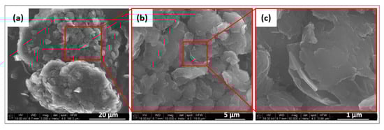 Graphene nanoplates (GNPs) used as fillers consist of sheets of graphene with a total thickness of several nanometers. SEM images of the introduced GNPs are presented in Figure 1. Plaque-shaped graphene agglomerates are observed. Graphene tends to agglomerate in chunks because of its small particle size, large surface area, and superior particle activity. The morphology is not well-defined, and the agglomerates have an irregular shape with dimensions in the order of a few microns.