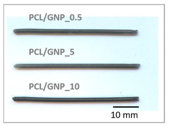 Polycaprolactone blends were prepared containing 0.5, 5, and 10 wt% of graphene content. PCL filaments in the form of composite sticks, for further 3D printing, were made using the injection molding method []. Three types of sticks named as PCL/GNP_0.5, PCL/GNP_5, and PCL/GNP_10 were produced, and a pure PCL filament stick was used as a reference material. Macroscopic images of samples are presented in Figure 2. Filaments with a diameter of 1.75 mm and a length of 50 mm were obtained. The samples differ in the intensity of black color.