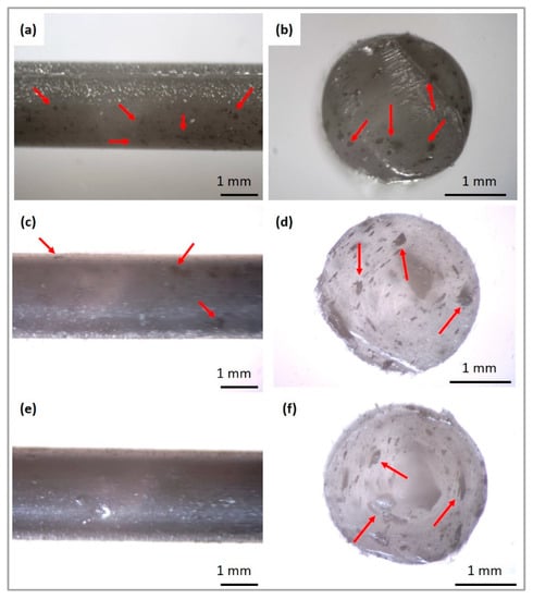 Microscopic images of obtained filaments and its cross section: PCL/GNP_0.5 (a,b); PCL/GNP_5 (c,d); PCL/GNP_10 (e,f). Red arrows indicates graphene concentration.