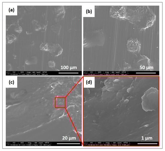 SEM images of PCL_GNP_0.5 stick surface at different magnifications (a–d).