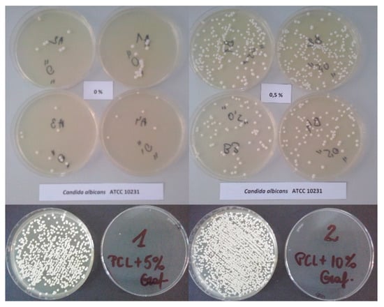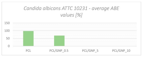 PCL and PCL/GNP_0.5 showed significant antimicrobial activity against C. albicans: for PCL, the average ABE was about 98%; when GNP was added to PCL, this value dropped to 68%. Increasing the content of graphene in the samples effectively reduced the antimicrobial activity. This may be due to the fact that carbon particles present in the suspension can become food for bacteria, through a similar process as in the case of Staphylococcus aureus.