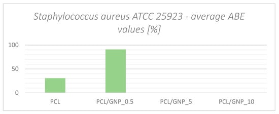 In the case of S. aureus, PCL without additives shows only slight antimicrobial activity at the 30% ABE level. Modification with a small amount of graphene (0.5%) significantly increases the antimicrobial efficacy, reaching a level of 90% ABE. Further increasing the graphene content significantly reduces and suppresses the antimicrobial properties of PCL. Several authors emphasized that graphene exhibits antimicrobial properties in the form of oxides []. The structure of graphene may damage the cell membranes of microorganisms and thus eliminate them.
