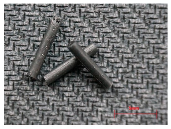 Microstructural analyses to assess the surface of all samples were carried out in a Nova NanoSEM 200 FEI (Waltham, USA) scanning electron microscope. All the samples were placed on a stainless-steel plate and covered with a carbon thin film by sputtering to avoid the electrostatic charge accumulation. Filaments in the form of sticks were evaluated using a stereomicroscope from the OPTA-TECH company (Warsaw, Poland), equipped with a CMOS 3 camera and OptaViewIS software version 4.3.0.6001. For microbiological tests, filaments were cut and bars with dimensions of 1.75 mm × 6 mm were prepared as shown in Figure 8. All the samples were plasma sterilized.