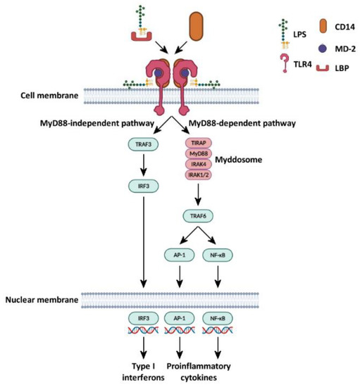 LPS–TLR4 signaling cascades in nucleated cells. LPS-binding protein (LBP) binds to LPS, inducing the exposure of the lipid A moiety and acting as a lipid-transfer protein. LBP drives the interaction of LPS with CD14, a glycosylphosphatidyl inositol-anchored glycoprotein. CD14 acts as a monocyte membrane coreceptor, but it can be released as a soluble protein. The interaction with CD14 allows the transfer of LPS to myeloid differentiation factor 2 (MD-2), a protein that interacts and cooperates with TLR4, activating the signal transduction. MyD88-dependent pathway involves MyD88, TIRAP, IRAK4, and IRAK 1/2, constituting the Myddosome. It activates TRAF6, which in turn activates two transcription factors (AP-1 and NF-κB) that allow the expression of proinflammatory cytokines. MyD88-independent pathway does not involve MyD88, but activates TRAF3, which in turn activates IRF3, another transcription factor, involved in type I interferon expression [21,22,27,29].