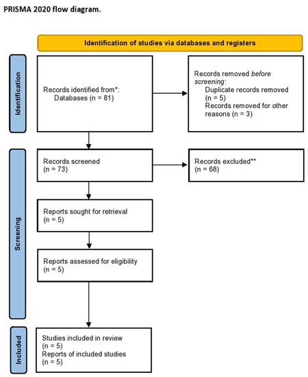 The electronic searches, after duplicate records were removed, provided a total of 73 citations. Of these, 68 were excluded after title/abstract screening (not relevant to the review inclusion criteria). We examined the full text of 5 publications remaining to summarize the most recent knowledge about CTLA4-linked autoimmunity in the pathogenesis of endometriosis and related infertility [23,26,27,28,31]. The PRISMA flow chart of the literature search is reported in Figure 1.