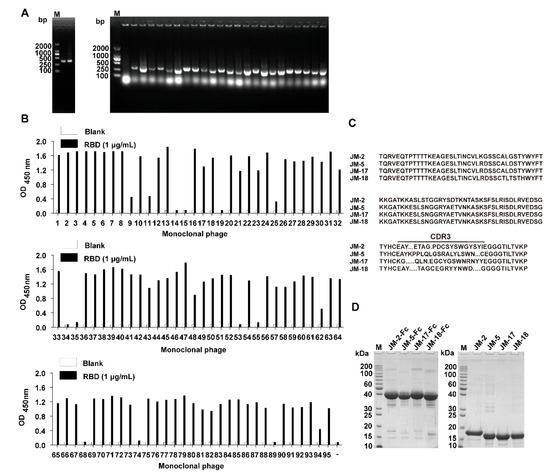Three C. plagiosum were immunized with recombinant SARS-CoV-2 RBD of high purity to obtain SARS-CoV-2 neutralizing antibodies with high affinity and specificity. The immunization consisted of three subcutaneous injections and two intravenous tail injections. Peripheral blood mononuclear cells were isolated from the immunized C. plagiosum. Reverse transcription was performed using the extracted RNA as a template. The VNAR coding region (about 340 bp) was amplified using PCR (Figure 1A). The PCR fragments and phagemid vector pR2 were digested, ligated, and transformed into TG1 cells. Finally, a VNAR phage library containing 3.0 × 108 transformants was successfully constructed. The diversity of the VNAR phage library was determined to be 88%. Additionally, the insertion rate of VNAR genes (95.8%) was evaluated using PCR on 24 randomly picked clones (Figure 1A). Bio-panning was performed thrice to enrich RBD-binding clones. An individual phage was randomly picked, and their RBD-binding activity was evaluated via monoclonal phage ELISA. A total of 84 from 95 clones were identified as positive clones, as they had a higher binding rate than the negative control (Figure 1B). Most ELISA-positive colonies showed high binding activity to the RBD. The positive colonies were sequenced, and the repeated sequences were removed. Four unique VNARs (JM-2, JM-5, JM-17, and JM-18) with distinct CDR3 were obtained based on the amino acid sequencing and alignment (Figure 1C).