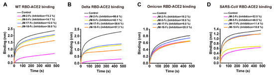 SARS-CoV-2 infection is initiated by the binding of RBD to the cell surface of ACE2. To assess the ability of VNAR-Fc fusions in blocking RBD-ACE2 interaction, a BLI assay was conducted. For blocking ACE2-WT RBD, JM-2-Fc was best, followed by JM-18-Fc, and JM-5-Fc and JM-17-Fc were weakest (Figure 4A). A similar situation was observed for blocking ACE2-Delta RBD, and possibly because the four VNAR-Fc fusions bound more strongly to Delta RBD than to WT RBD, they have a higher blocking activity against ACE2-Delta RBD than against ACE2-WT RBD (Figure 4B). Maybe due to the reduced binding activity, none of the VNAR-Fc fusions were obviously active in blocking ACE2-Omicrn RBD interaction (Figure 4C). JM-2-Fc and JM-5-Fc were also active in blocking ACE2-SARS-CoV RBD interaction (Figure 4D). Among the four VNARs, JM-2-Fc was most effective in blocking the ACE2 binding to the WT, Delta, and SARS-CoV RBDs, with inhibition rates of 73.2%, 86.6%, and 52.5%, respectively (Figure 4A,B,D).
