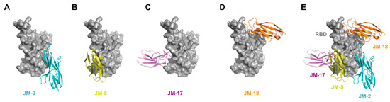 In silico molecular docking of VNARs binding to RBD. (A–D) Binding mode of JM-2 (A), JM-5 (B), JM-17 (C), and JM-18 (D) to RBD. (E) The docking structures alignment of JM-2 (cyan), JM-5 (yellow), JM-17 (magenta), and JM-18 (orange) in complex with RBD (gray).