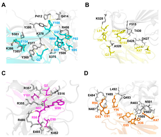 Based on the epitope competition results, docking simulation was conducted to predict and compare the binding affinity of our VNARs with WT SARS-CoV-2 RBD. The structural models of the complex between VNARs and the RBD were constructed using the modeling program ClusPro. The ΔG values of VNARs’ binding for the RBD were −4.3, −8.3, −2.0, and −3.7 kcal·mol−1 for JM-2, JM-5, JM-17, and JM-18, respectively, which are in line with the KD values of these VNARs. The binding of VNARs to the RBD was displayed by PyMOL (Figure 7). JM-2, JM-5, JM-17, and JM-18 formed 17 hydrogen bonds and two salt bridges, five hydrogen bonds and two salt bridges, ten hydrogen bonds and three salt bridges, and 18 hydrogen bonds and four salt bridges with the RBD, respectively (Figure 8).